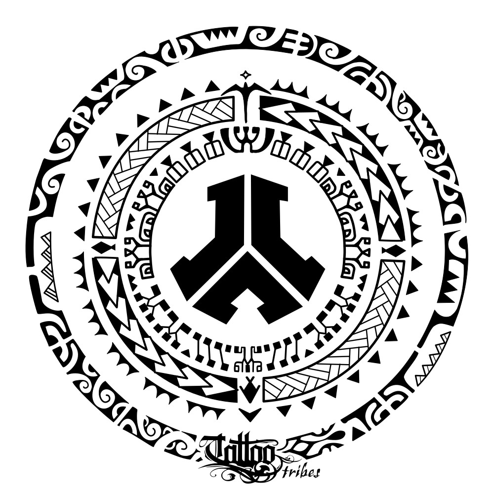 The outer circle includes symbols of protection (lizard, shark teeth, tiki hands and eyes) and continuous change (waves)