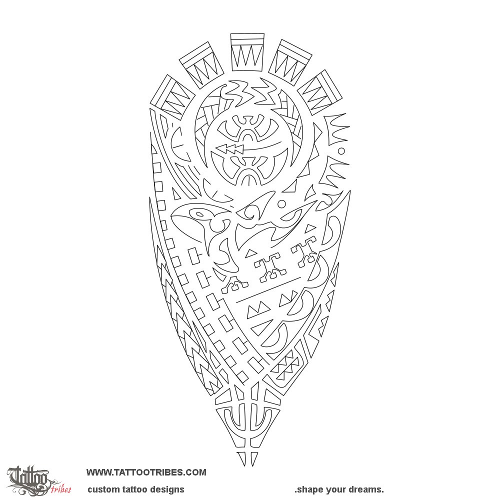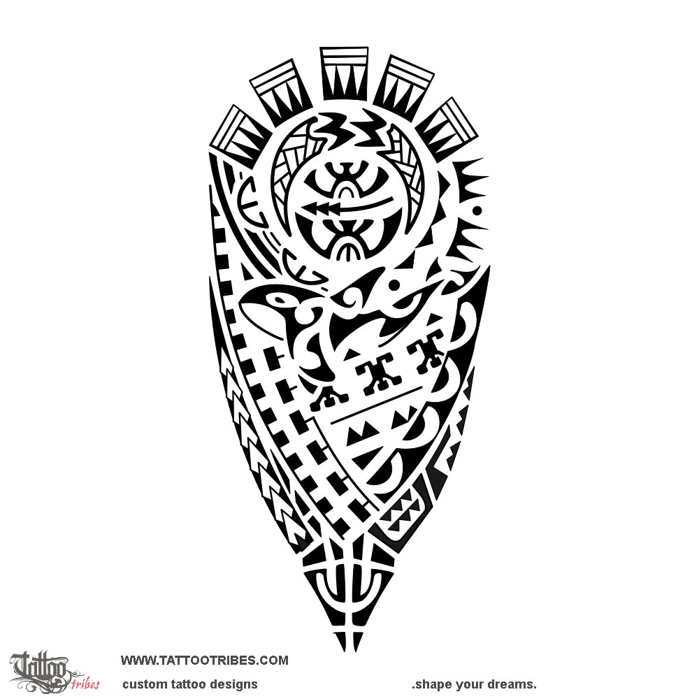 This Polynesian tattoo for the calf is a redesign that Alessandro asked of a tattoo we previously prepared for his pec to represent the bond between him and his daughter, symbolized by the warrior holding his daughter up inside a sun made of coconut leaves (prosperity).