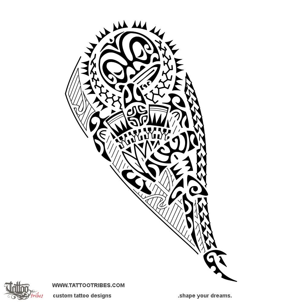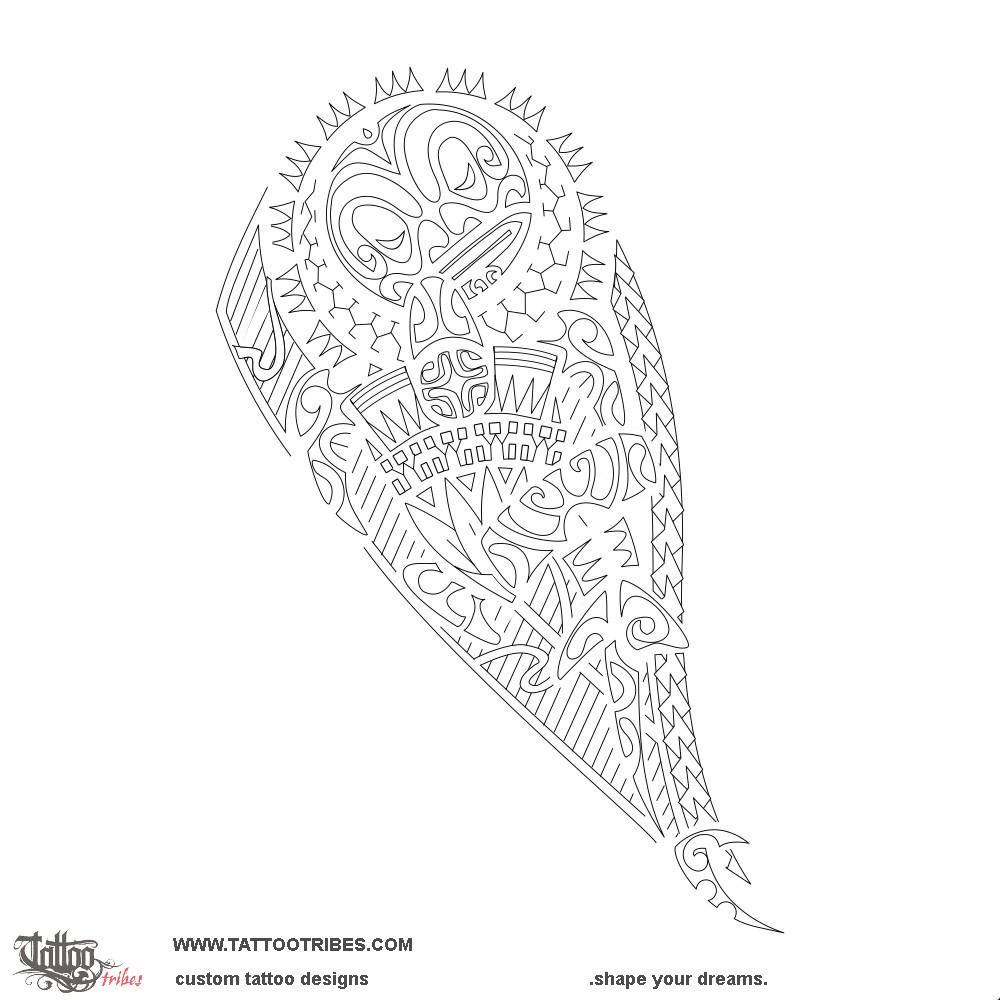 The tiki surrounded by the aniata motif symbolizes protection from the ancestors, who stand guard on the family, while Ricardo is represented inside the hammerhead shark as the warrior who protects and guides his loved ones.