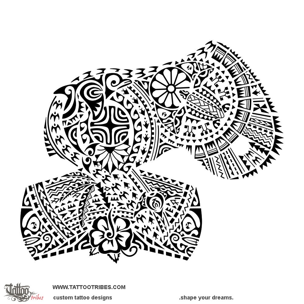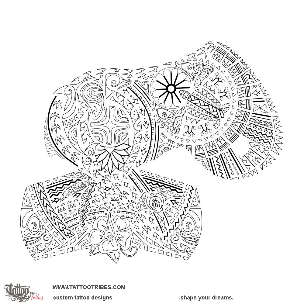 Tiki on tha arm and on the pec bring protection from all sides, while coconut leaves symbolize prosperity and serenity.